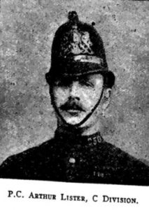 From the Police Review, 1st January 1915: “PC Arthur James John Lister was born at Rotherhithe, London. He joined the Royal Garrison Artillery on February 3rd, 1904, and was transferred to the Army Reserve on March 5th, 1907. He joined the City of London Police on October 7th, 1909, and was called up on the Army Reserve on August 5th last. He was killed in action whilst serving with the Expeditionary Force in France on September 14th last. Deceased leaves a widow and two children”.